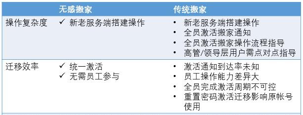 针对传统式电子邮箱拆迁方法来讲,风险性存有于拆迁全过程的重要环节。搜集登陆密码全过程中,步骤繁杂非常容易错误,登陆密码密文传送与储存,存有数据泄露风险性。密码重置的阶段,与AD电子邮箱集成化的全部系统软件登陆密码将必须所有统一重设,重设后密码必须向用户派发,一对一派发将产生极大的劳动量。传统式电子邮箱拆迁必须用户自助式开展激话实际操作,管理人员的用户学习培训经济成本、答疑解惑经济成本,及用户自助式激话的用时都将无法估量。不管哪样方法激话搬新家,搬新家全过程中用户不可以更改密码,对用户一切正常应用电子邮箱产生了一定限定。而无感觉搬新家,在实际操作的复杂性、迁移高效率、与网络信息安全层面,都具备巨大的优点。