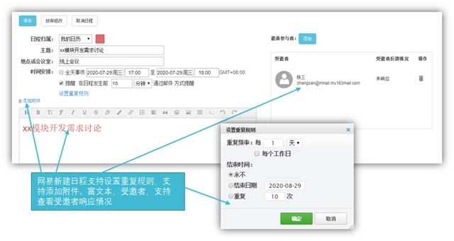 网易企业邮箱循环系统日程能协助您像手机上中闹钟设置一样,在特定時间内开展提示,人性化设定循环系统标准,并适用改动,灵便适用解决各种各样“突发性”情景。受邀者可依据具体情况接纳或回绝循环系统日程中的某一日程或一些日程,提高应用感受。